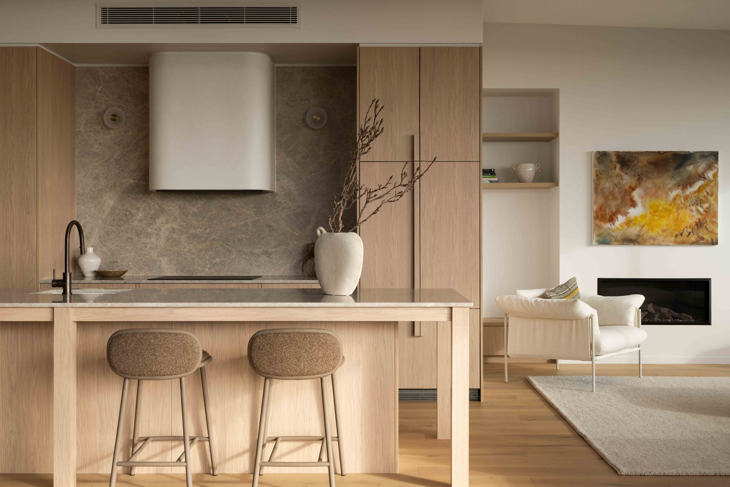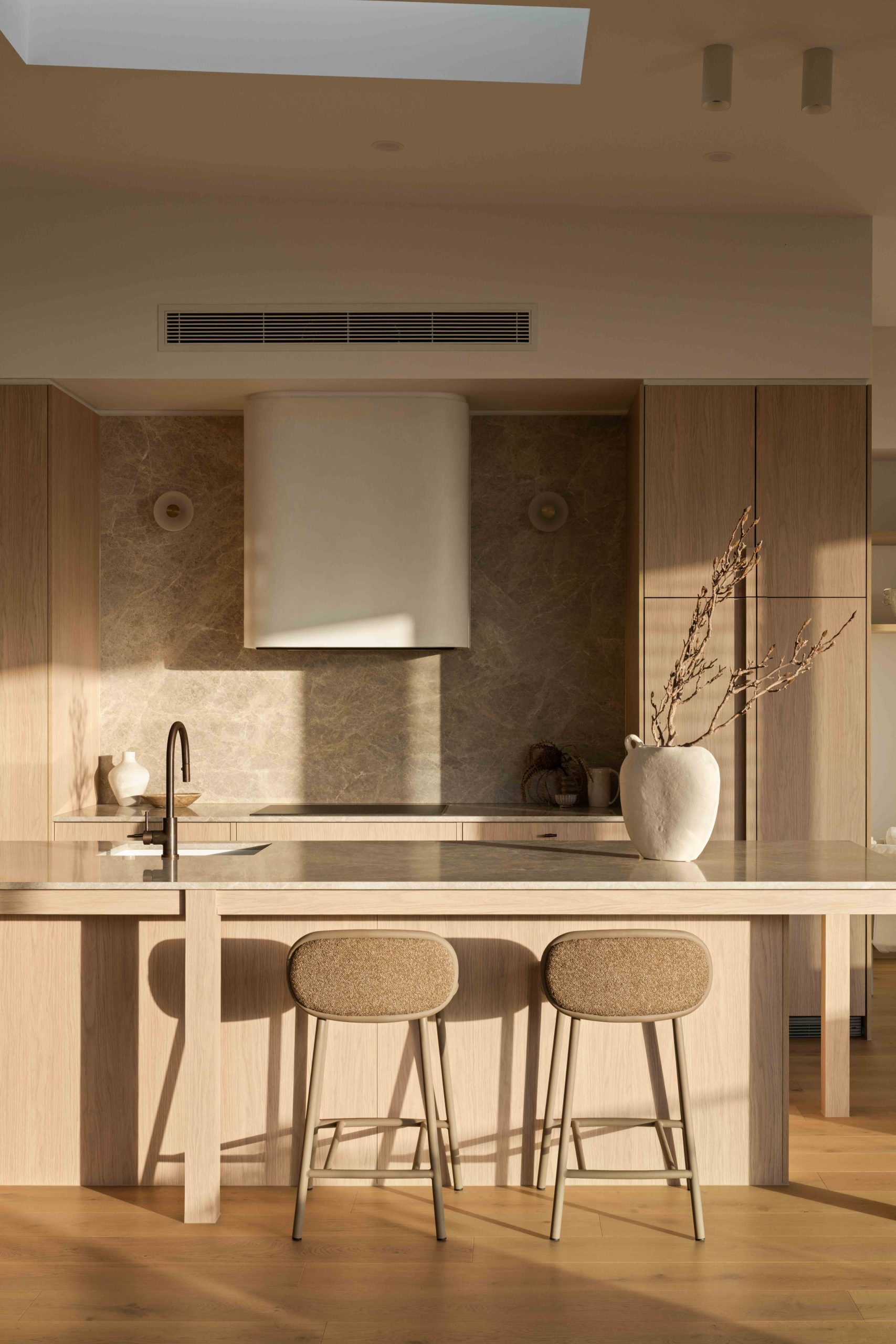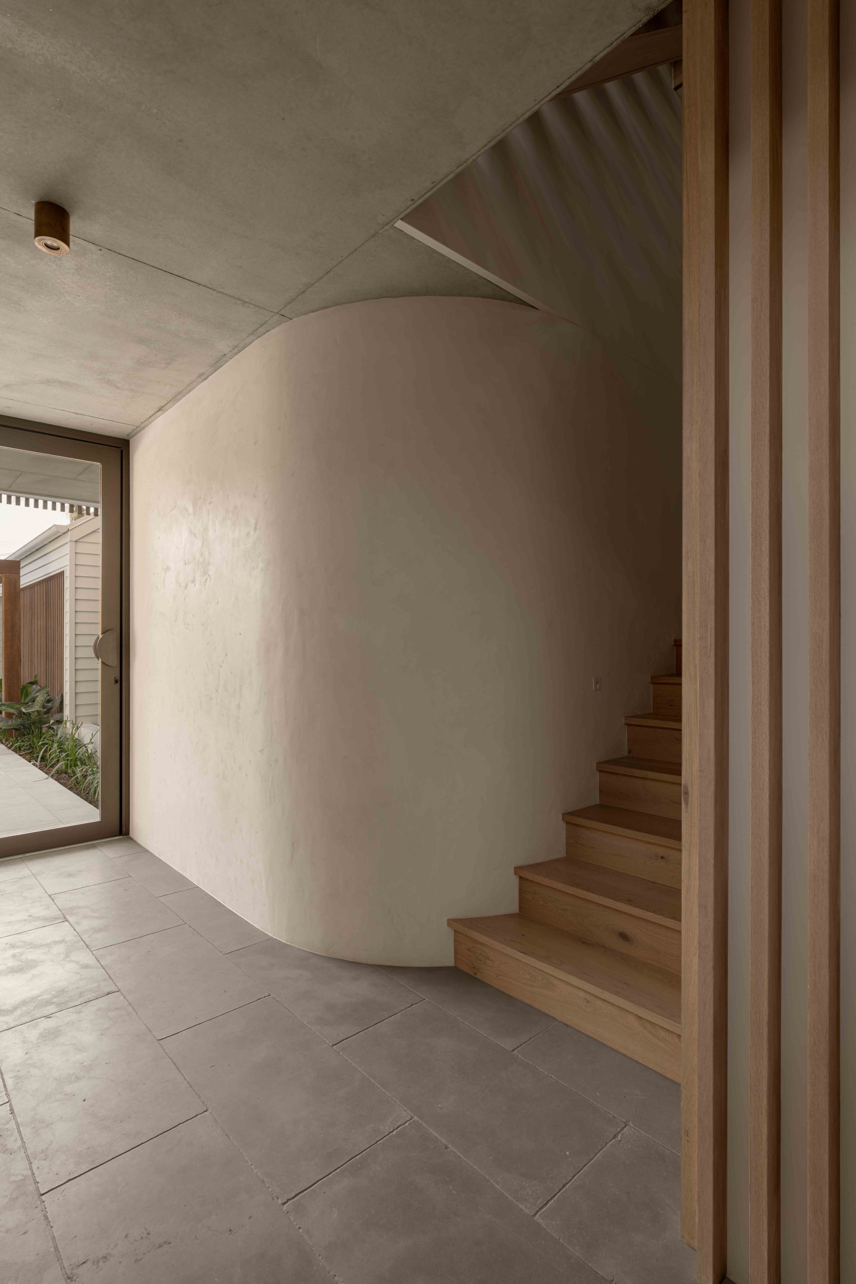 Next, sweeping curved masonry walls, finished in Venetian render, rise on either side. Their softened forms guide movement. In doing so, they gently funnel you into a semi-subterranean foyer. This moment marks a clear transition. The space feels cooler. Heavier. More contemplative.