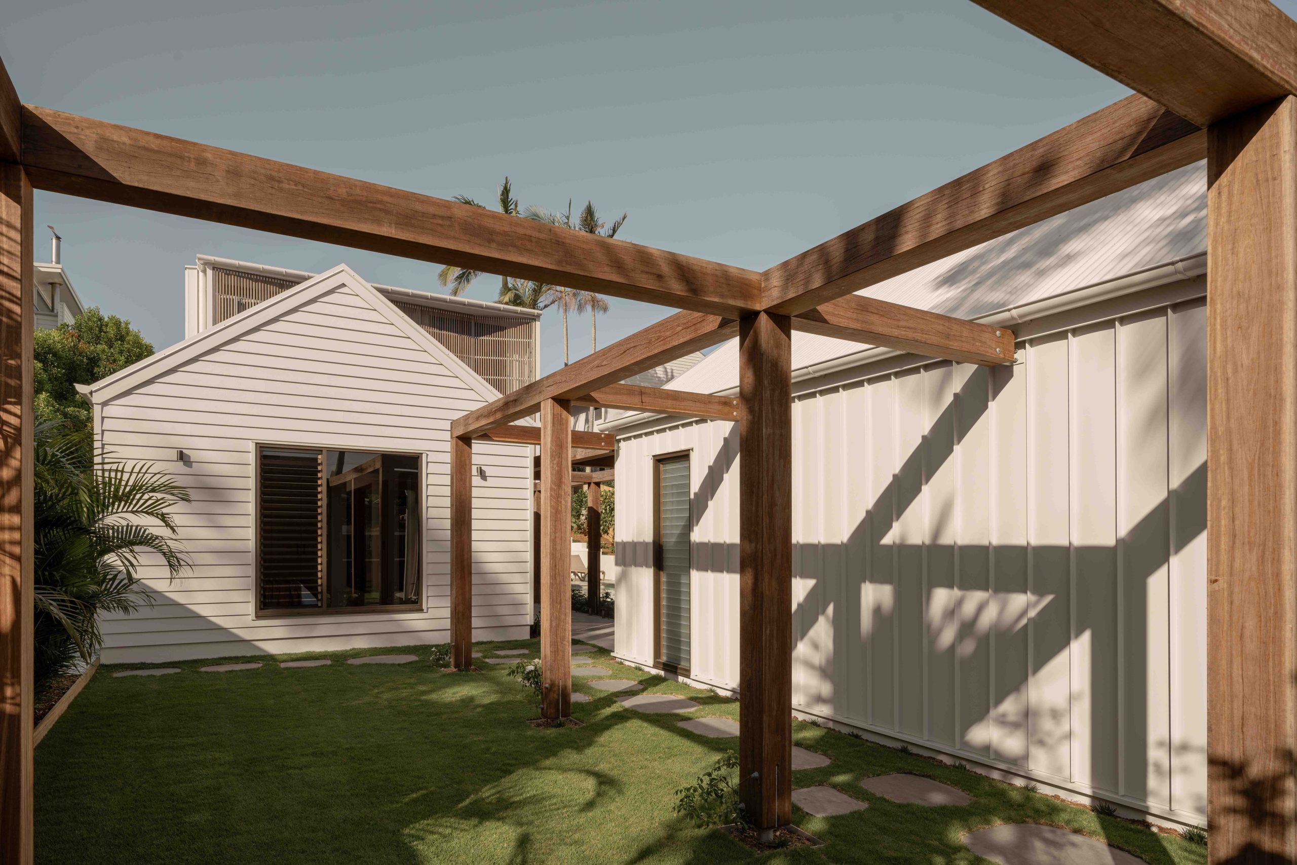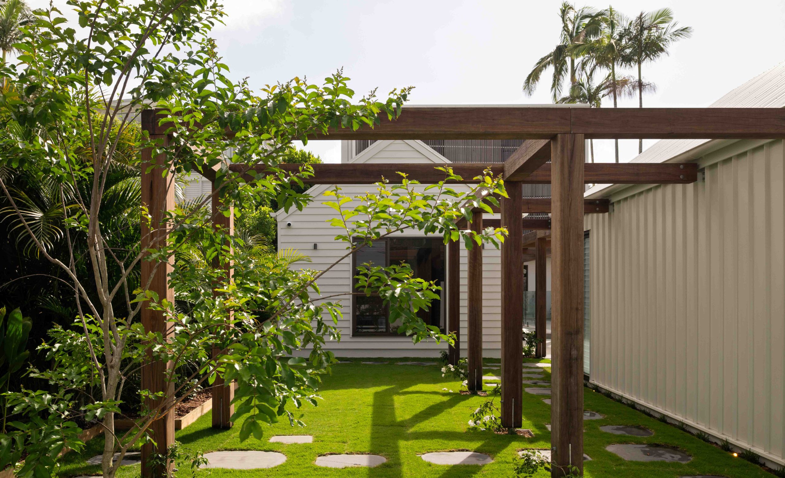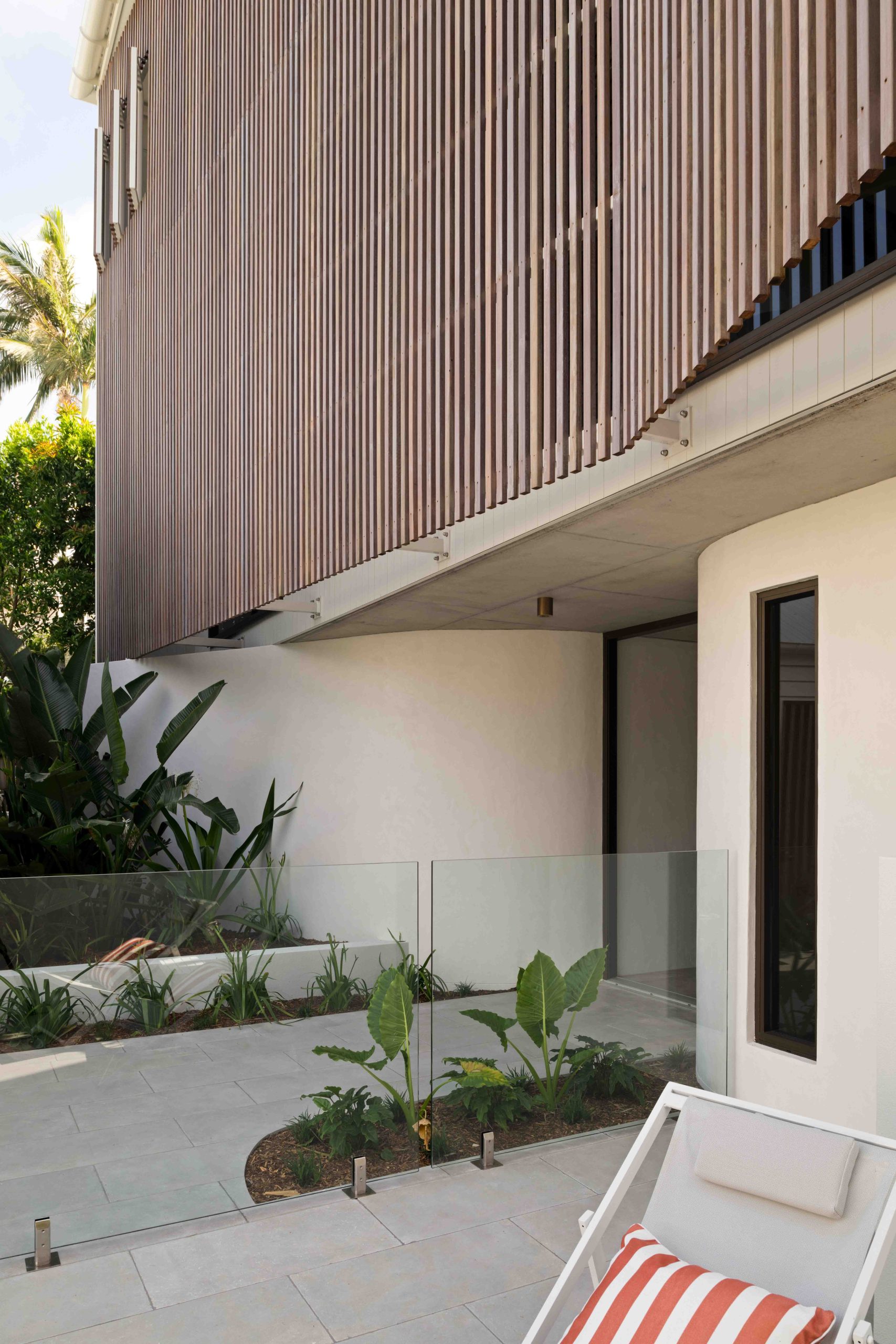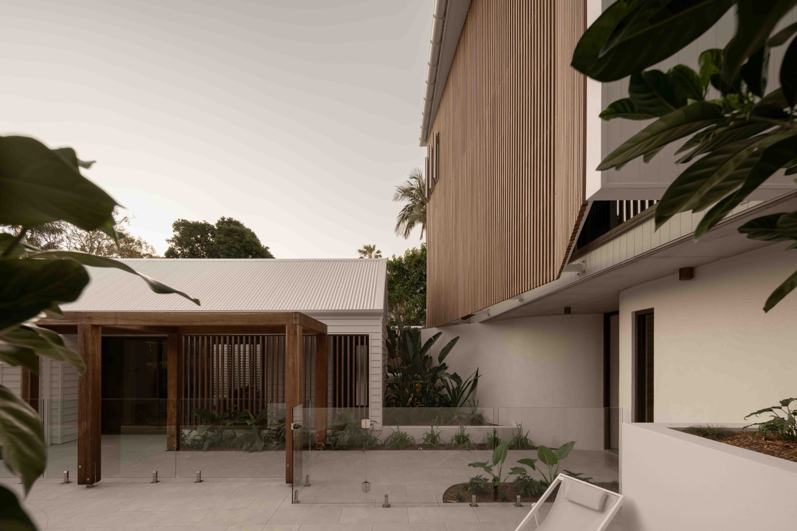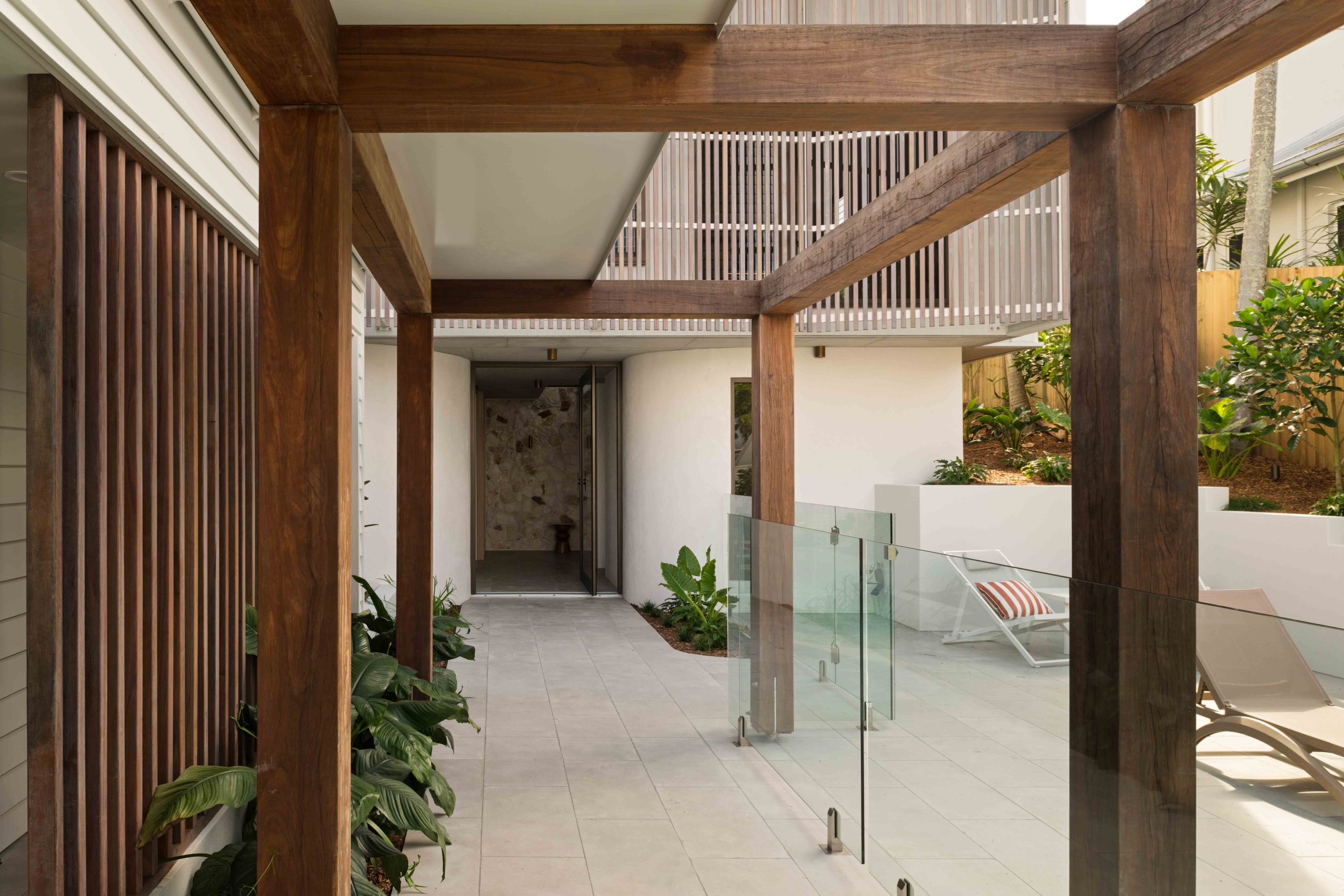 From arrival, the experience unfolds with intent. First, a forecourt layered with lush green foliage slows movement and softens the approach. Then, a timber arbour draws you forward. It filters light overhead while framing controlled views through to the main residence. Anchoring this threshold, a two-storey brise soleil of Australian hardwood establishes scale, rhythm, and shade.