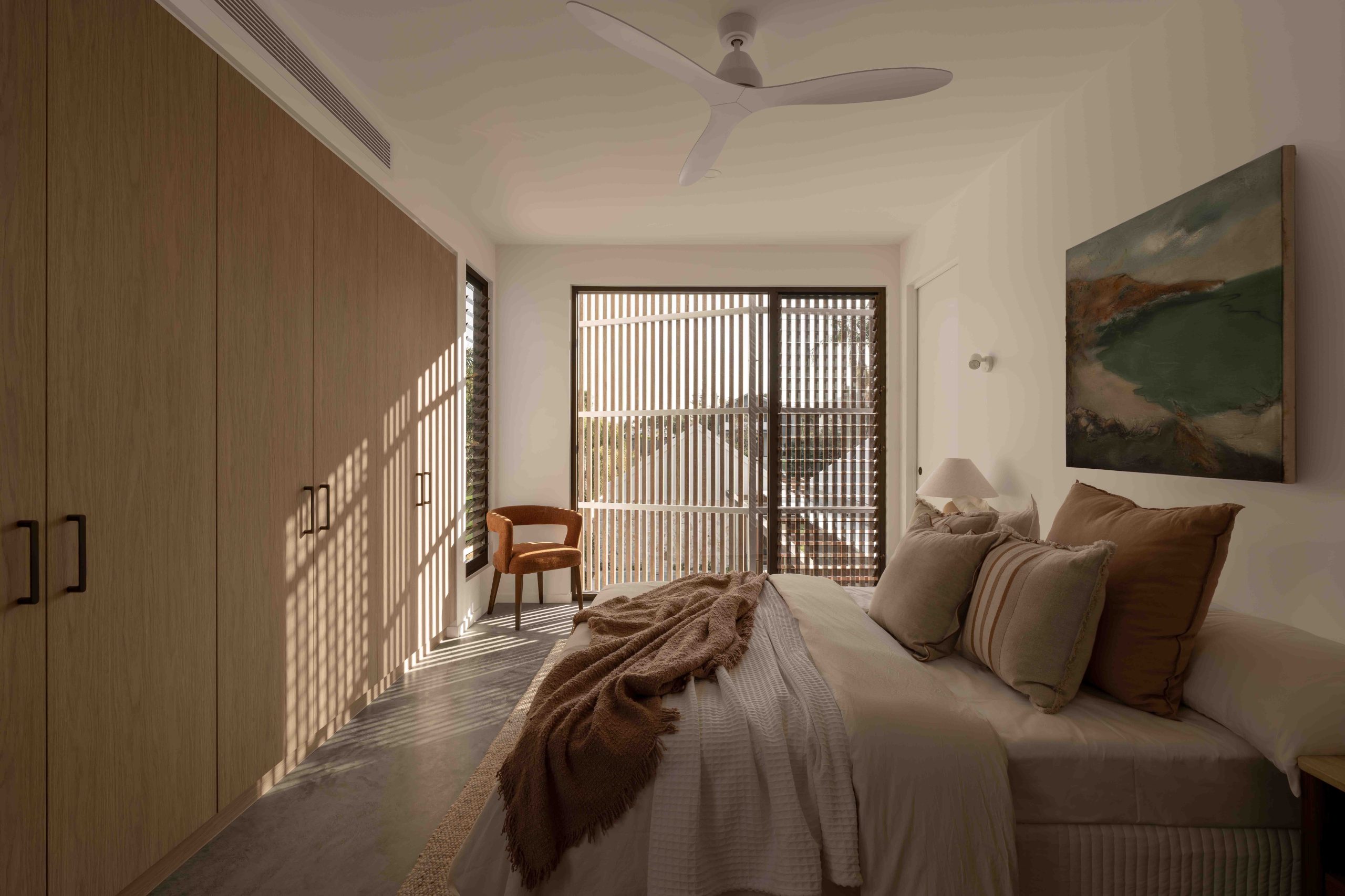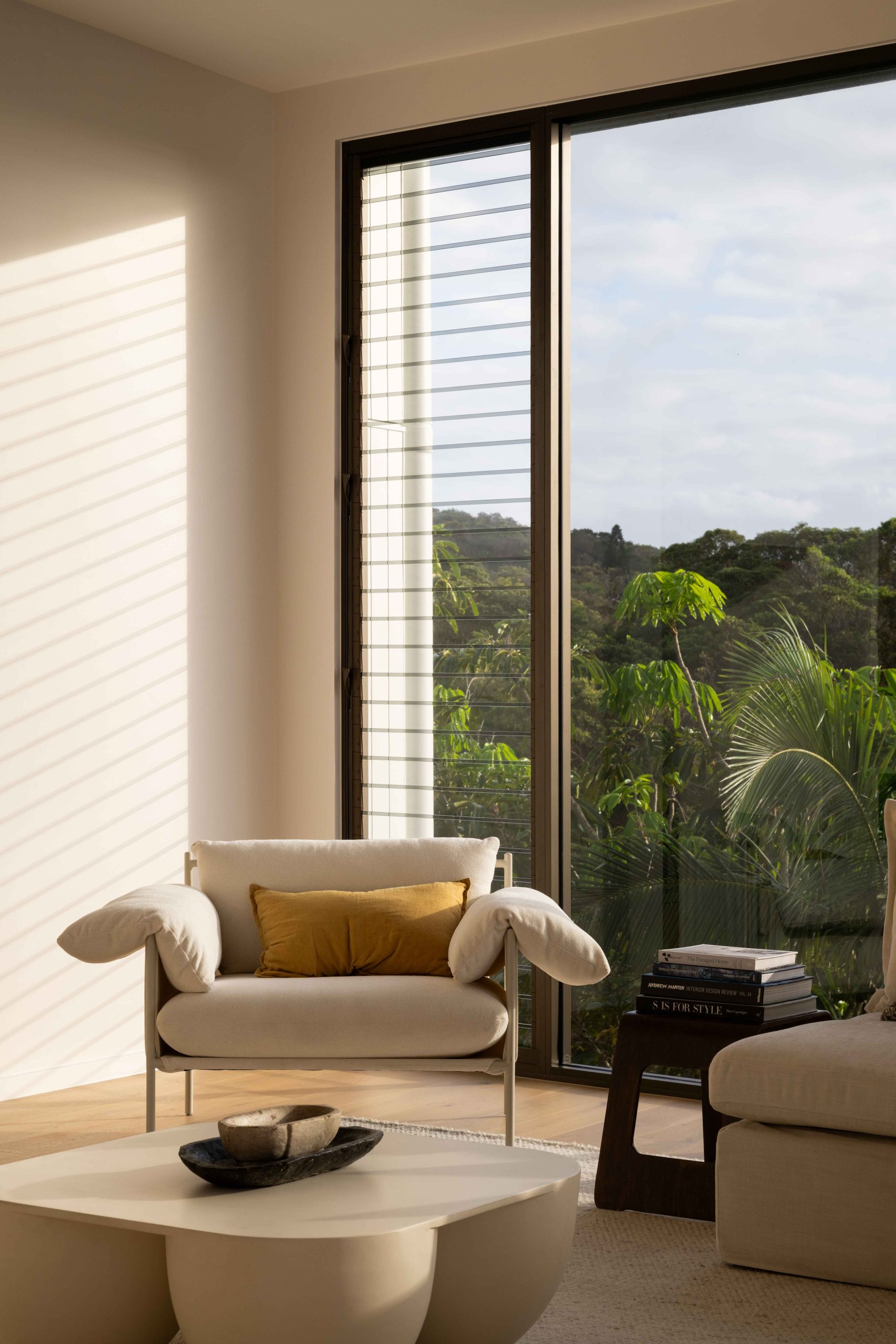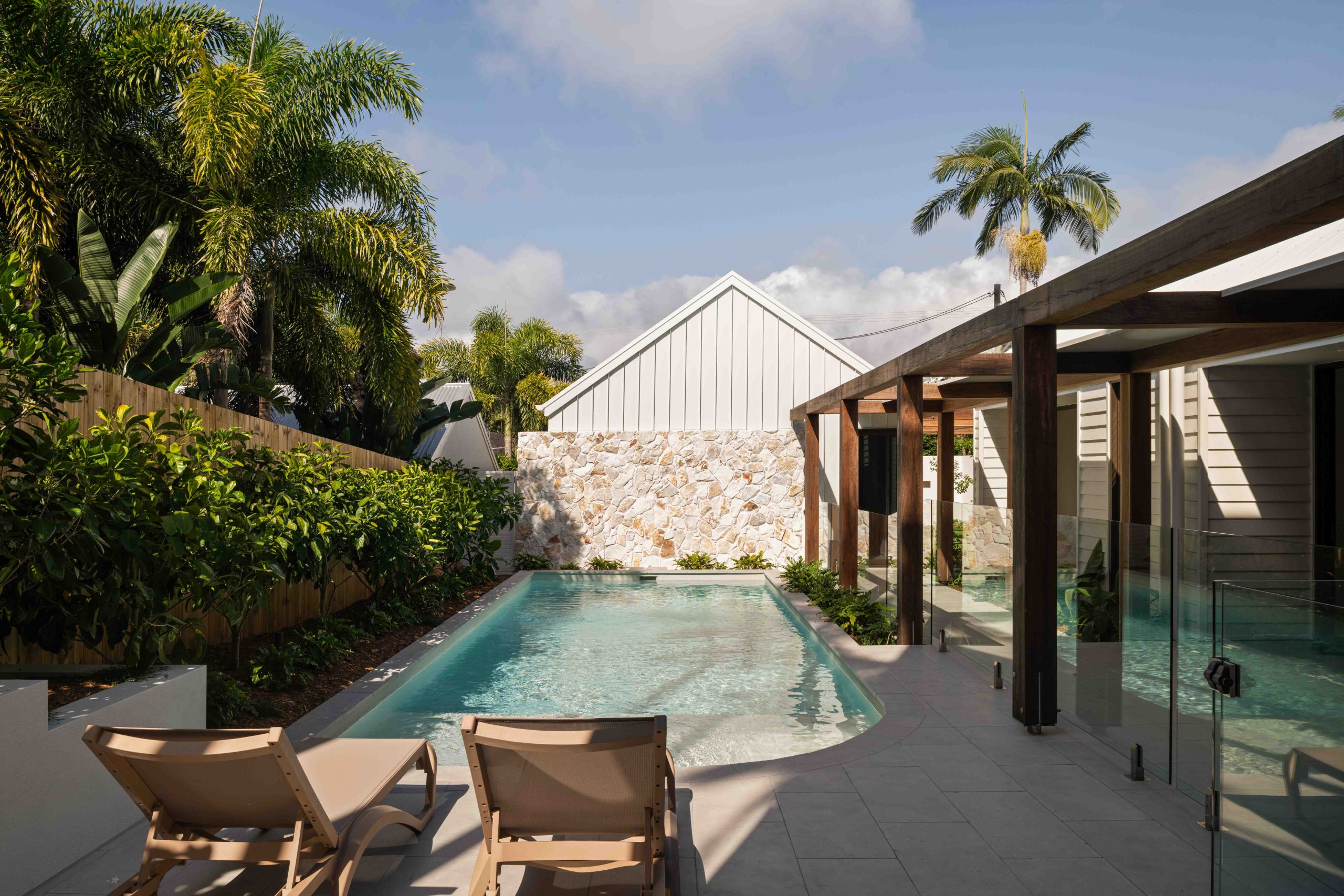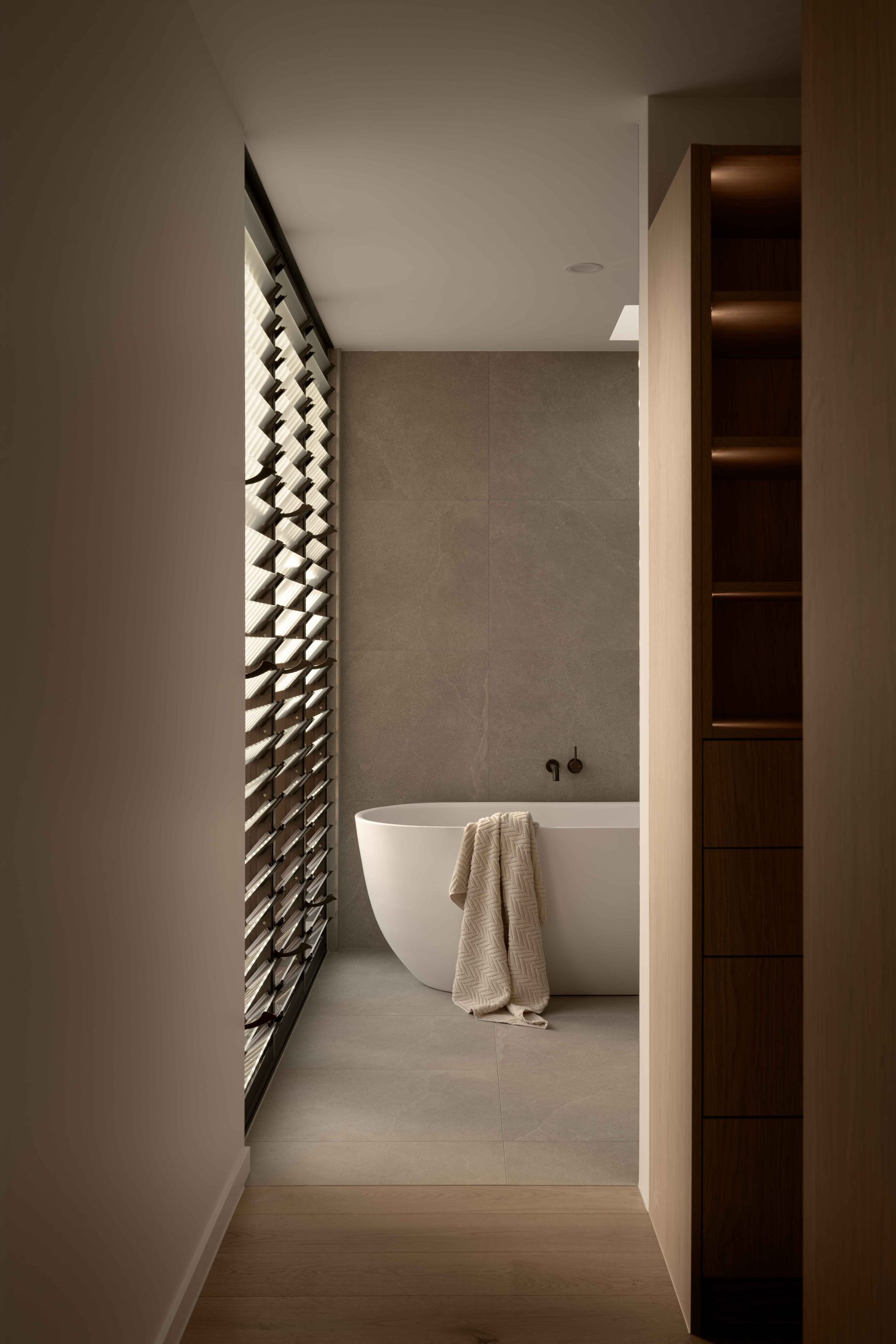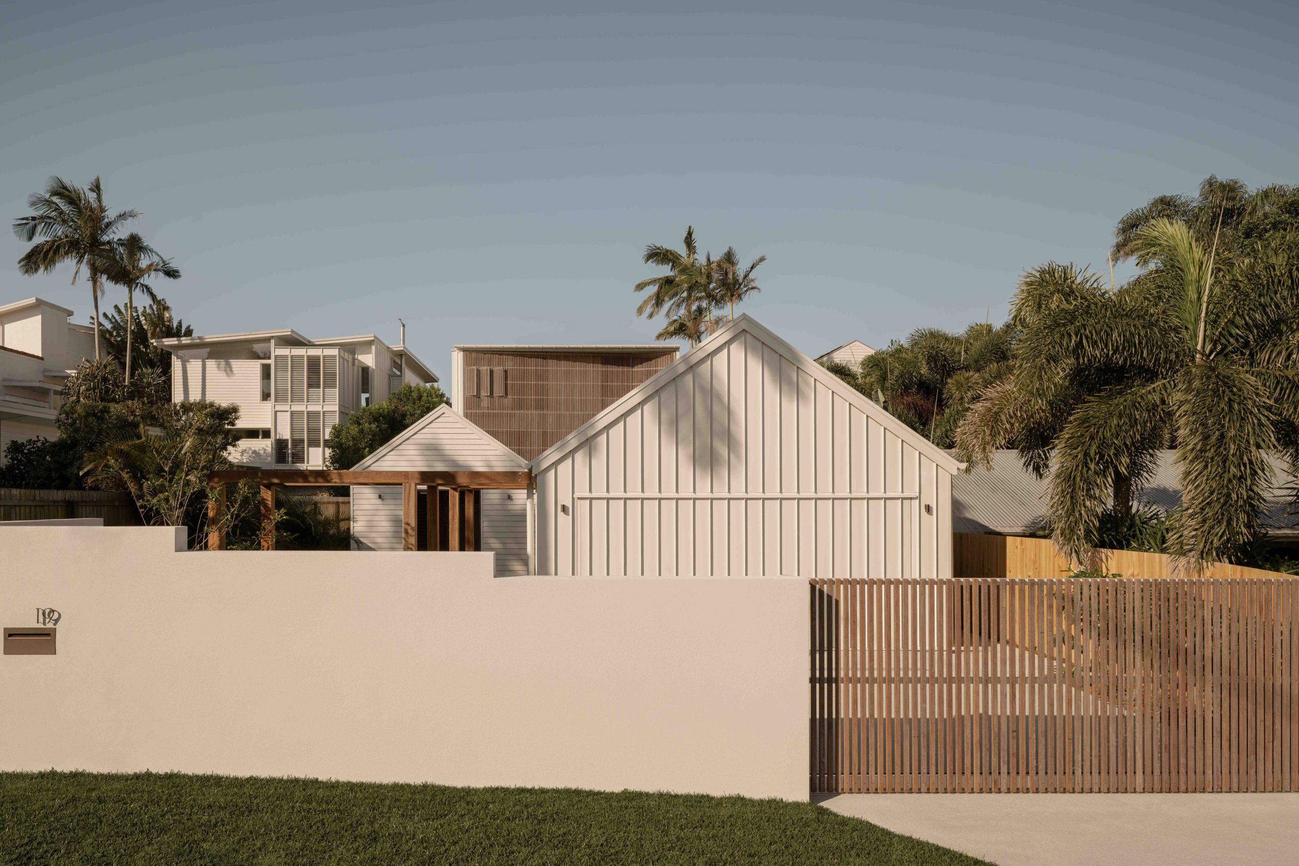 From arrival, the experience unfolds with intent. First, a forecourt layered with lush green foliage slows movement and softens the approach. Then, a timber arbour draws you forward. It filters light overhead while framing controlled views through to the main residence. Anchoring this threshold, a two-storey brise soleil of Australian hardwood establishes scale, rhythm, and shade.