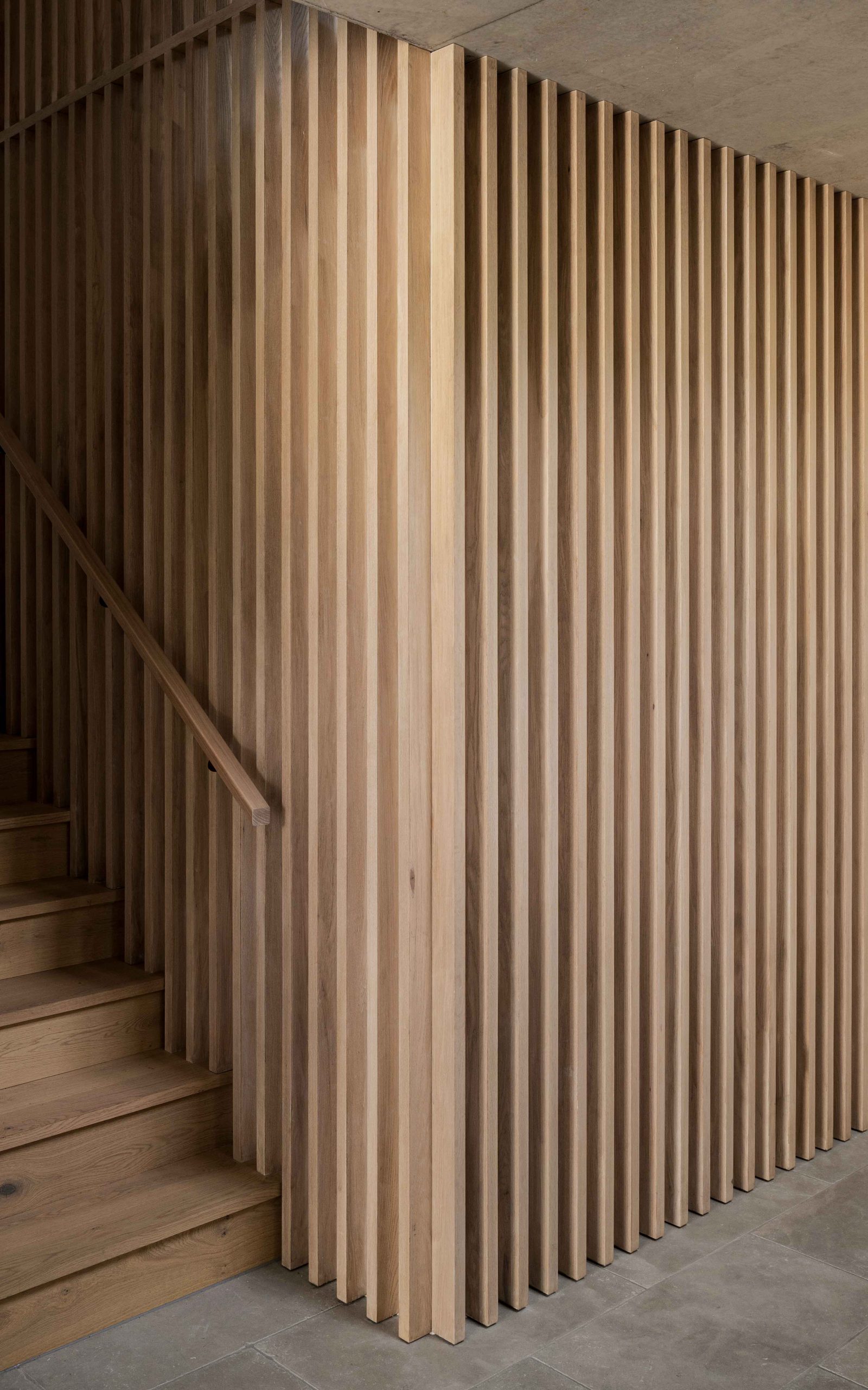 From this point, the journey shifts again. Now, movement turns upward. A highly detailed timber stair rises through three levels within a tall vertical void. Alongside it, a light well introduces shifting daylight. As you ascend, light and shadow reveal texture and craftsmanship in measured stages.